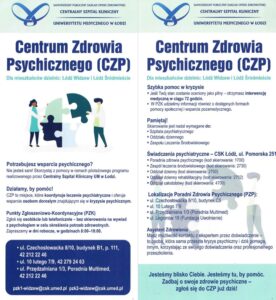 - PZK Centrum Zdrowia Psychicznego, ul Czechosłowacka 8/10 budynek B1 pok. 111; 42 675 72 25; 42 675 75 27 ; e-mail: pzk1-widzew@csk.umed.pl