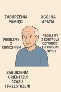 Do najczęstszych objawów możemy zaliczyć problemy z pamięcią oraz zaburzenia orientacji czasu i przestrzeni. Wraz z postępowaniem choroby dochodzą inne problemy zdrowotne tj. apatia, brak chęci kontaktu z innymi, osobami, zanik apetytu, problemy z poruszaniem się.