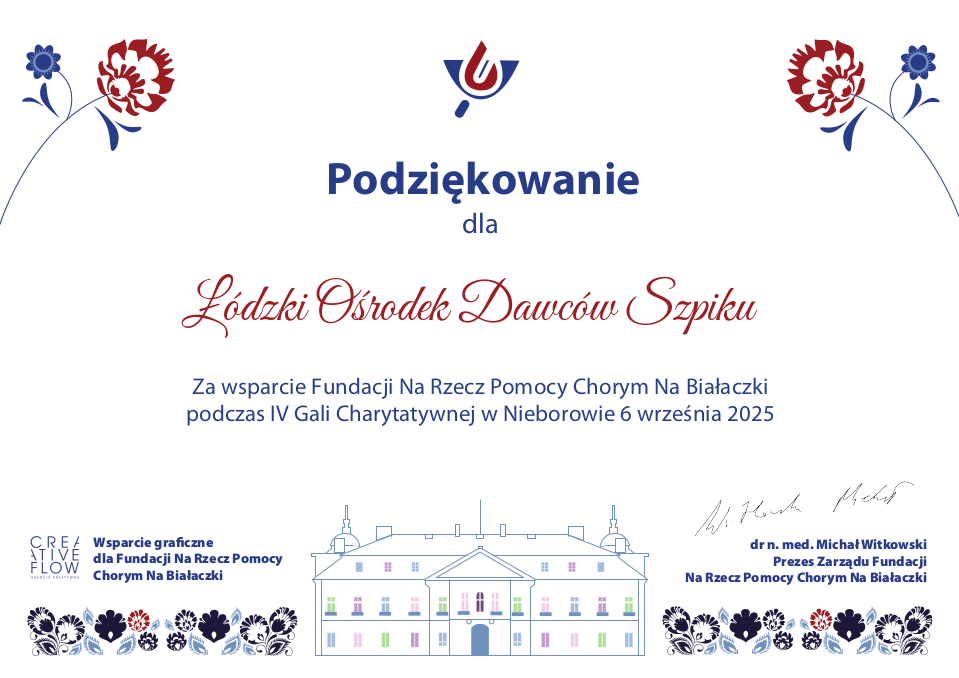 Pragniemy poinformować, iż Łódzki Ośrodek Dawców Szpiku otrzymał podziękowania za wsparcie Fundacji Na Rzecz Pomocy Chorym Na Białaczki.